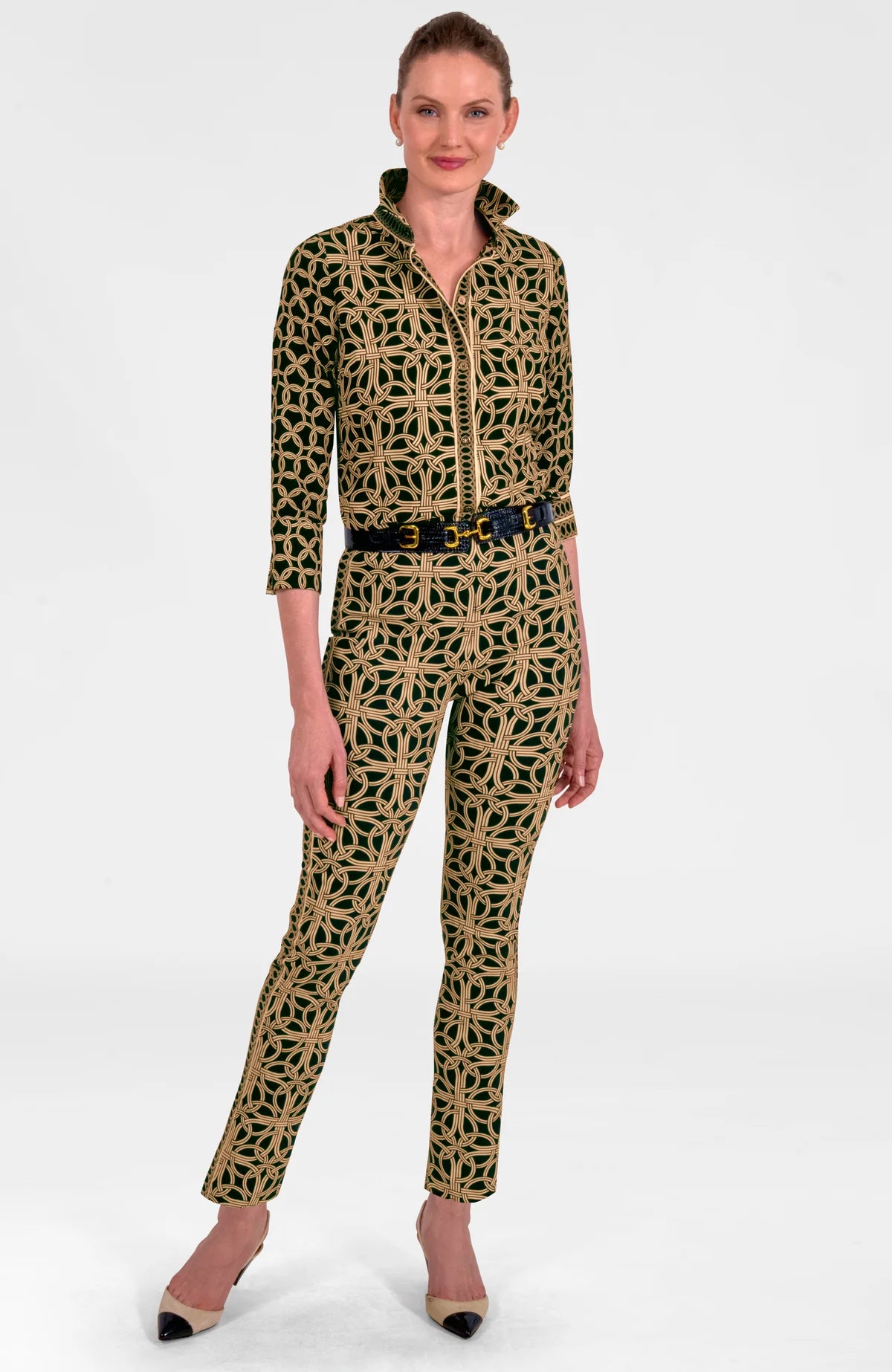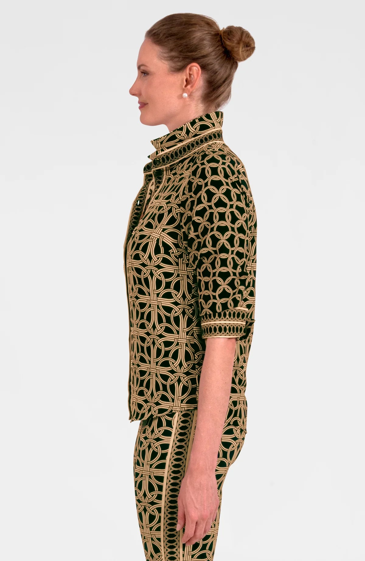 Relaxed boyfriend shirt featuring a 26″ length, shiny brass button front, and classic men’s shirt hem. Designed with 3/4 sleeves and optional turn-back cuffs, front placket, and inside back panel accented in the signature Ring Toss print.