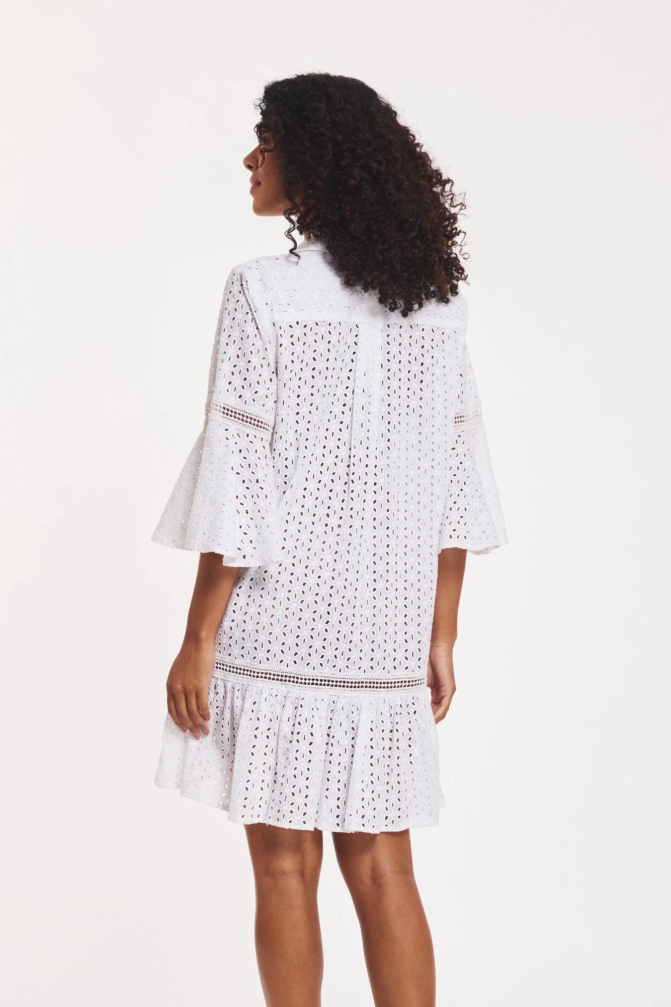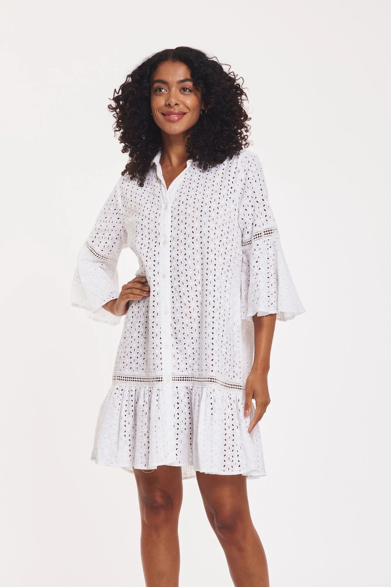 Indulge in timeless sophistication with the Delaney White Eyelet Lace Dress. Crafted from breathable cotton eyelet lace, this elegant silhouette features delicate flare sleeves and intricate lace trim for a feminine, elevated finish. A refined yet effortless piece designed to enhance your everyday wardrobe.