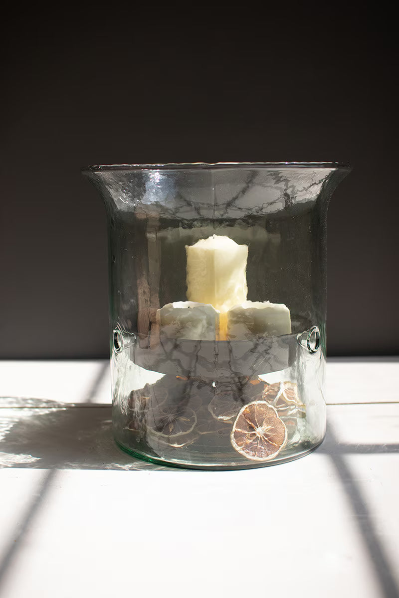 Hand blown Columbian glass has a rustic metal floating insert.