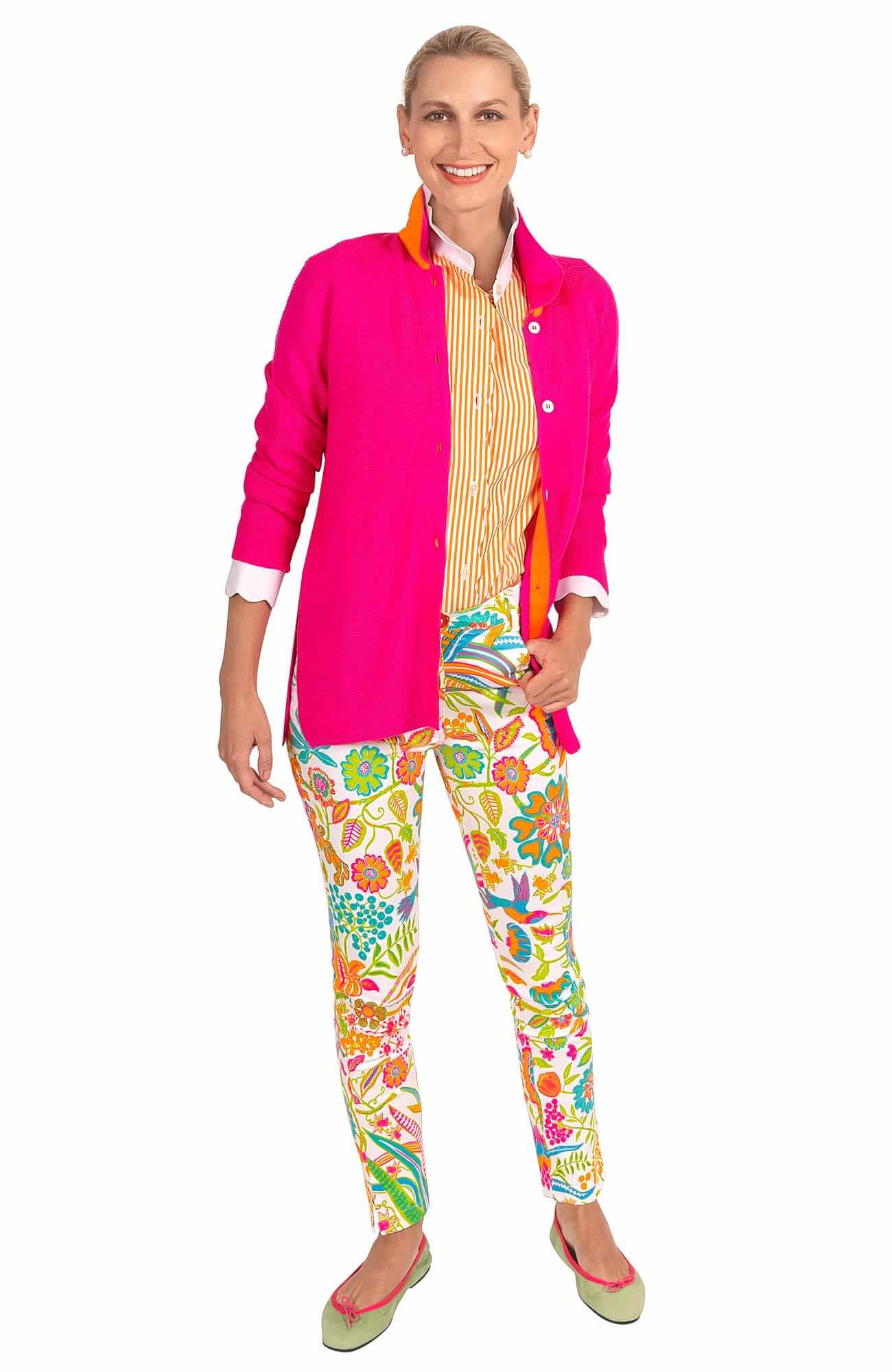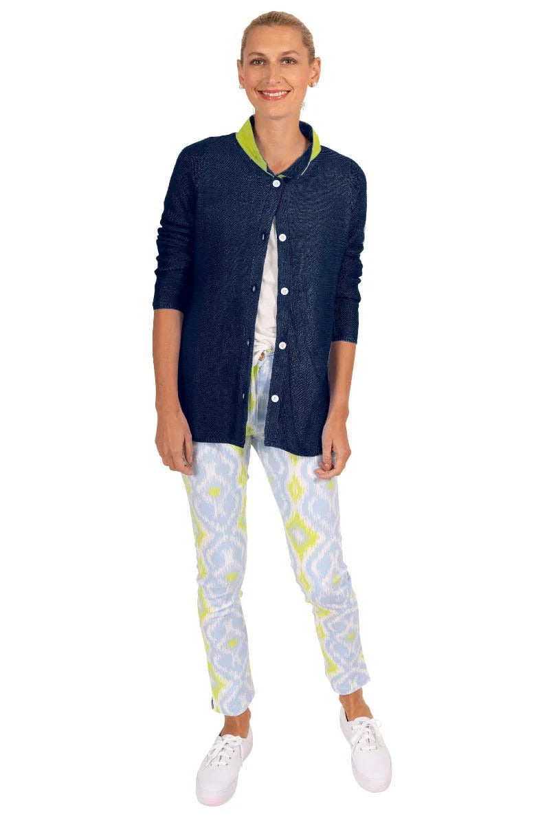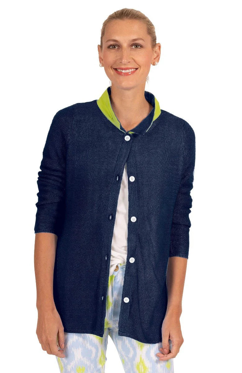 A versatile wardrobe essential with chic, effortless style. This button-front knit features a refined shell closure with contrast cotton grosgrain trim along the inside placket and under the collar for a touch of subtle sophistication. The relaxed silhouette falls to a 26" length, with long sleeves and 9" side slits that enhance movement. Textured garter stitch with crochet-edged detailing and a ribbed hem give this piece a softly tailored finish—perfect layered over denim or dressed up with trousers for cooler days.